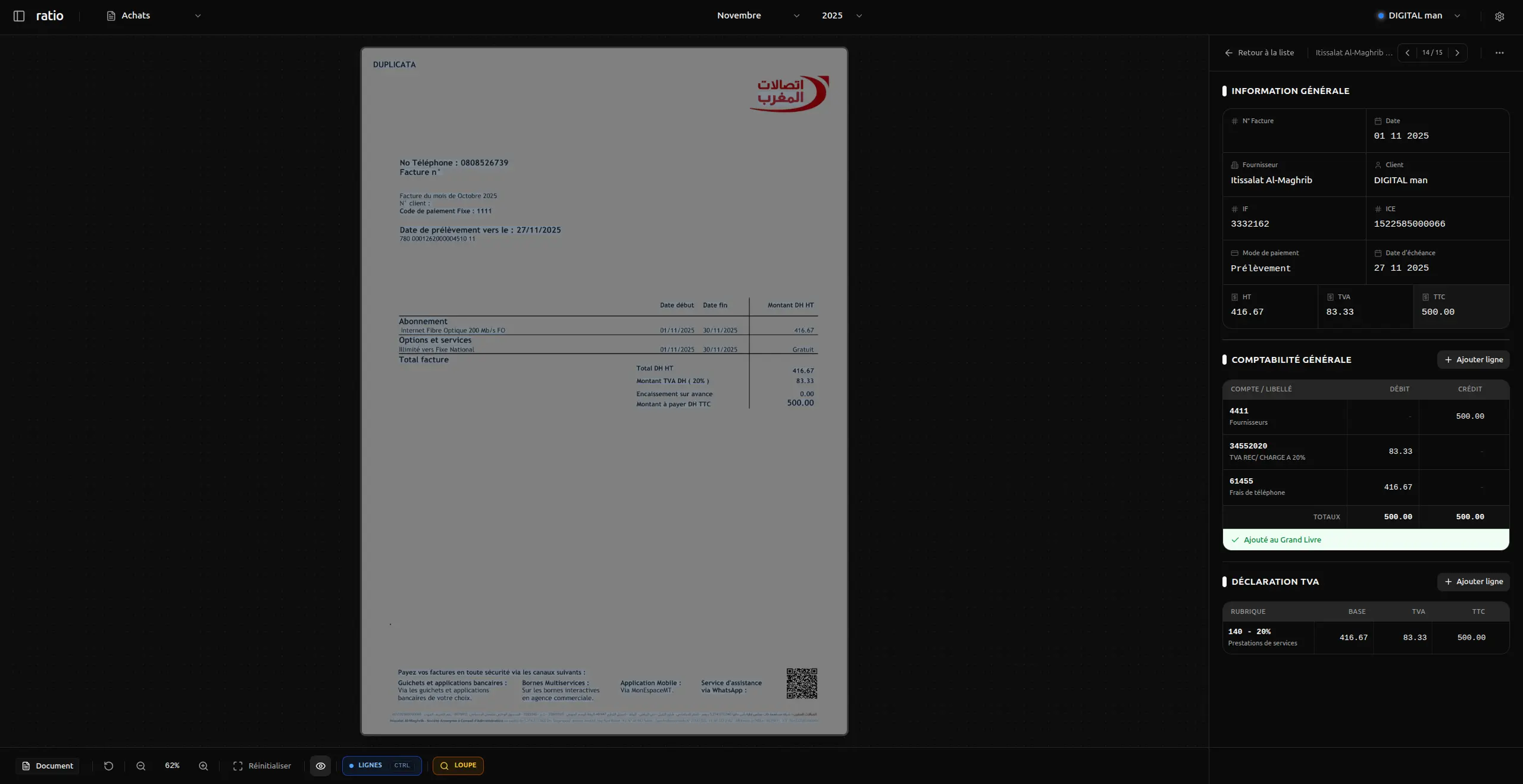 Scannez vos factures et laissez Ratio extraire automatiquement les montants, la TVA et les comptes comptables. Des heures de saisie manuelle transformées en quelques secondes.